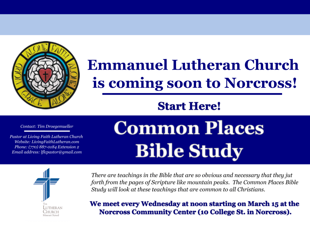The Lord has now opened up a door for us to do ministry in a brand new location in Norcross. Siloam Korean Church has graciously allowed us to have ministry space on the campus that is tailor made for Emmanuel Lutheran. We praise God for these brothers and sisters in Christ and our opportunity to gather this very Saturday, October 4 at 6 PM. The new location is 1870 Willow Creek Parkway in Norcross. This will be a most important gathering, for we will be discussing Phase 3 of this awesome ministry! We want you there for your ideas, encouragement, and prayers! All are welcome!